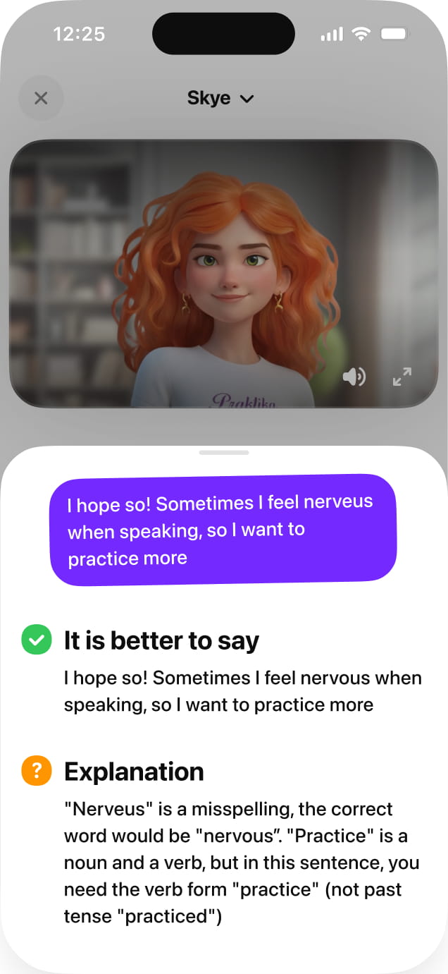 04 / 05Grow from your mistakesGet instant, gentle corrections on pronunciation, grammar, and word choice — so every slip becomes progress