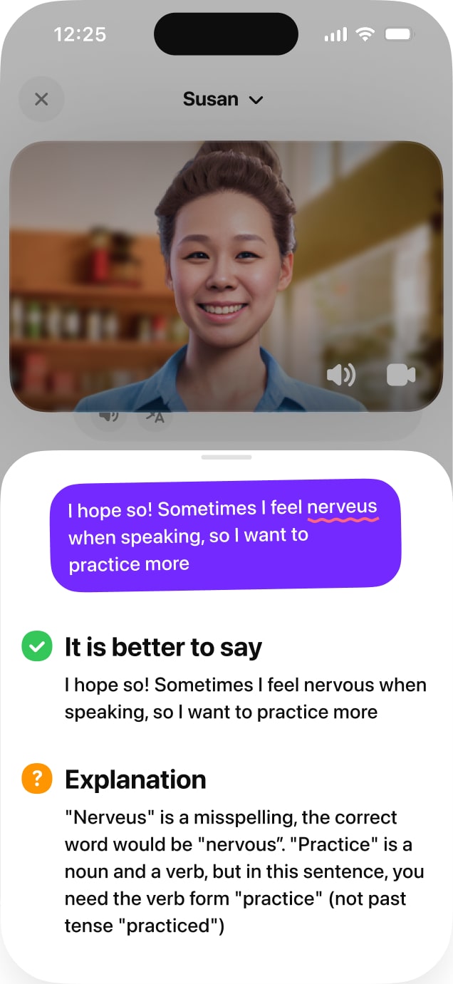04 / 05Grow from your mistakesGet instant, gentle corrections on pronunciation, grammar, and word choice — so every slip becomes progress