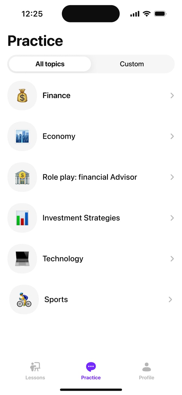 05 / 05Speak freely on any topicBegin a free conversation anytime — practice what matters to you, in your own words